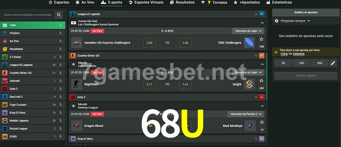 O 68U oferece uma grande seleção de opções de apostas em e-sports com probabilidades competitivas